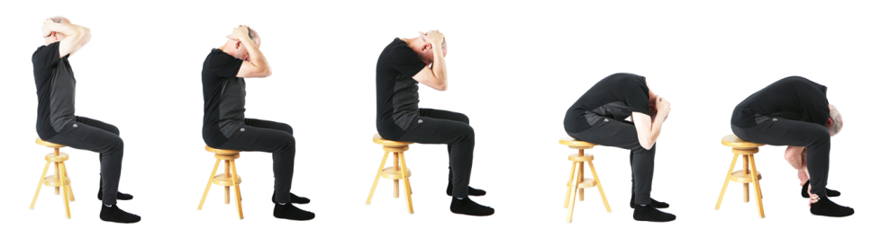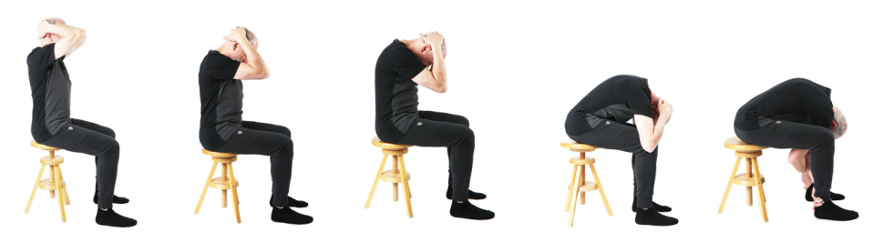 Atsisėskite ant kėdės, sulenkite kojas per kelius stačiu kampu, sunerkite pirštus ir uždėkite rankas kuo aukščiau ant pakaušio, bet ne ant viršugalvio! Atpalaidavę kaklą pradėkite lenkti galvą (tik rankomis!), smakrą artindami prie krūtinkaulio. Tuo metu visas kūnas turi išlikti tiesus, nes tempiama tik kaklinė stuburo dalis. Tempimą turite jausti sprando srityje. Kai po kurio laiko smakru jau pasieksite krūtinkaulį, rankomis galėsite lenkti nugarinę stuburo dalį dar labiau ir tempsite ne tik kaklo, bet ir krūtininės stuburo srities tiesiamuosius raumenis.), o nugaros tempimą jausite jau stuburo apačioje. Kiekvieną tiesiamųjų raumenų sritį tempkite po 20–30 sekundžių 4 kartus. Jei šių pratimų metu tempimo nejaučiate, pratimų nedarykite.